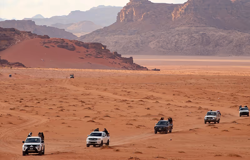 Al llegar, realizaremos una excursión de aproximadamente dos horas en vehículos 4x4 conducidos por Beduinos expertos, quienes conocen profundamente la zona y sus rutas tradicionales. Durante el recorrido, podremos admirar la inmensidad del desierto, sus dunas rojizas, sus montañas doradas y las formaciones naturales que han sido escenario de numerosas películas y expediciones científicas.